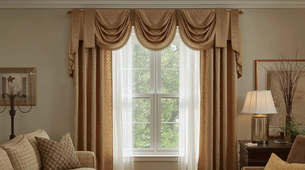 Swag valances feature dips and folds that form graceful curves, often used in traditional décor.